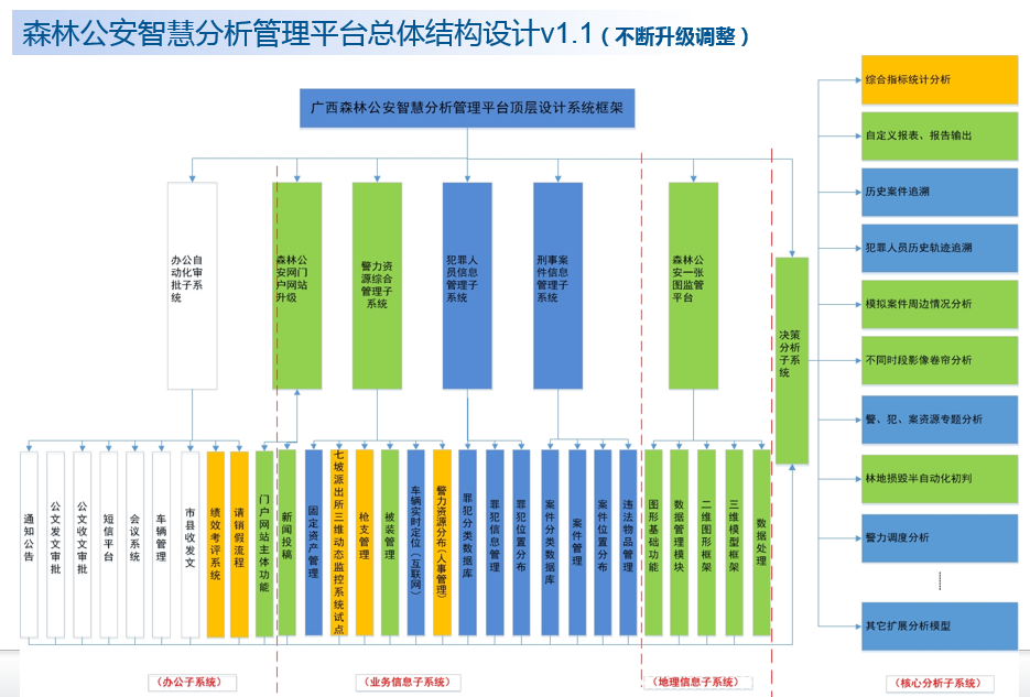 利用信息化手段规范和创新广西全区森林公安业务管理体系,通过业务自动化、装备管理、智能统计、决策分析、GIS等子系统为建设重点,构建和完善服务于森林公安智能管理、打击犯罪、改革创新的信息化支撑平台。